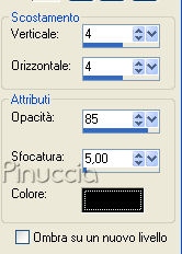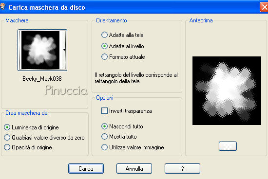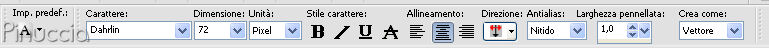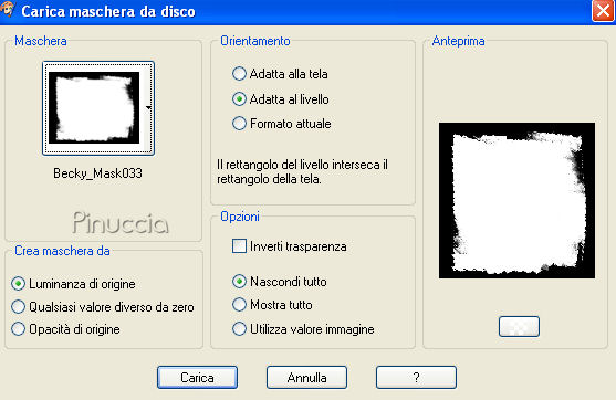 qui puoi trovare qualche risposta ai tuoi dubbi. Se l'argomento che ti interessa non è presente, ti prego di segnalarmelo. Questo tutorial è stato scritto in PSP X2, ma può essere eseguito anche con le altre versioni di PSP. Per tradurlo, l'ho eseguito con PSP X. Occorrente: Un tube a scelta. Il resto del materiale qui Metti le maschere nella cartella Maschere. Metti i pennelli nella cartella Pennelli. Apri il font Dahrlin e minimizzalo nella tua area di lavoro. Lo troverai nella lista dei font disponibili, quando ti servirà. Imposta il colore di primo piano con #5a4962. Imposta il colore di sfondo con il nero. 1. Apri una nuova immagine BIANCA 600 x 600 pixels. 2. Apri Paper 1, e vai a Modifica>Copia. Torna al tuo lavoro e vai a Modifica>Incolla come nuovo livello. Cambia la modalità di miscelatura di questo livello in Luminanza (esistente). 3. Livelli>Nuovo livello raster. 4. Attiva lo strumento Selezione , rettangolo,clicca sull'icona Selezione personalizzata ![]() e imposta i seguenti settaggi: ![]() 5. Apri Paper 3, e vai a Modifica>Copia. Torna al tuo lavoro e vai a Modifica>Incolla nella selezione. Selezione>Deseleziona. 6. Livelli>Carica/Salva maschera>Carica maschera da disco. Cerca e carica la maschera Becky Mask 033: ![]() Livelli>Elimina, e rispondi sì alla domanda Unire la maschera nel livello corrente: ![]() Livelli>Unisci>Unisci gruppo. 7. Cambia la modalità di miscelatura di questo livello in Luminanza (esistente). 8. Immagine>Ruota per gradi, 10 gradi a sinistra: ![]() 9. Livelli>Nuovo livello raster. Riempi con il colore di primo piano.10. Livelli>Carica/Salva maschera>Carica maschera da disco. Cerca e carica la maschera Becky Mask 038: ![]() Livelli>Elimina, e rispondi sì alla domanda Unire la maschera nel livello corrente: Livelli>Unisci>Unisci gruppo. 11. Abbassa l'opacità di questo livello al 40%. 12. Apri Binder, e vai a Modifica>Copia. Torna al tuo lavoro e vai a Modifica>Incolla come nuovo livello. 13. Immagine>Ruota per gradi, con i settaggi precedenti: ![]() Spostalo a sinistra.14. Cambia la modalità di miscelatura di questo livello in Luminanza (esistente). 15. Nella paletta dei livelli attiva il livello di sfondo. 16. Attiva lo strumento Pennello ![]() cerca e seleziona il pennello v2sje-tsjoe, e applicalo a sinistra, usando il colore di primo piano. 17. Cerca e seleziona il pennello TK_smudge 23, e applicalo in alto a sinistra. 18. Cerca e seleziona il pennello Kitty 835, e applicalo a destra e a sinistra. 19. Attiva il livello raster 2. 20. Apri il tuo tube e vai a Modifica>Copia. Torna al tuo lavoro e vai a Modifica>Incolla come nuovo livello. Posiziona il tube al centro.21. Effetti>Effetti 3D>Sfalsa ombra, con i seguenti settaggi. ![]() 22. Attiva il livello raster 2. 23. Apri bluepoppies 1. Immagine>Ridimensiona, al 65%, tutti i livelli non selezionato. Modifica>Copia. Torna al tuo lavoro e vai a Modifica>Incolla come nuovo livello. Sposta i fiori a destra.24. Livelli>Duplica. Immagine>Rifletti. Sposta i fiori un po' più in basso.25. Chiudi il colore di primo piano. 26. Attiva lo strumento Testo , font Dahrlin:![]() scrivi un nome (io ho scritto Angelina), o quello che preferisci. 27. Livelli>Converti in livello raster. 28. Effetti>Effetti 3D>Sfalsa ombra, con i seguenti settaggi: ![]() 29. Livelli>Nuovo livello raster. 30. Attiva lo strumento pennello ![]() cerca e seleziona il pennello lyndiebrush 123 004. 31. Applica il pennello sulle lettere usando il colore di primo piano. 32. Aggiungi il tuo nome e/o il tuo watermark. 33. Livelli>Unisci>Unisci tutto, e salva in formato jpg. ![]() Se hai problemi o dubbi, o trovi un link non funzionante, o anche soltanto per un saluto, scrivimi 19 Febbraio 2008 |