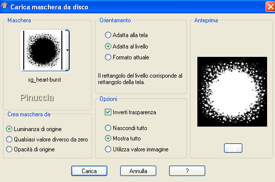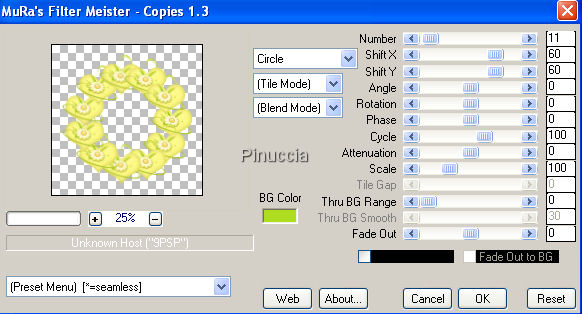 qui puoi trovare qualche risposta ai tuoi dubbi. Se l'argomento che ti interessa non è presente, ti prego di segnalarmelo. Questo tutorial è stato scritto in PSP X2, ma può essere eseguito anche con le altre versioni di PSP. Per tradurlo, l'ho eseguito con PSP X. Occorrente: Un tube a scelta. Il resto del materiale qui Il tube che ho usato è di Patries. Metti la maschera nella cartella Maschere. Filtri: Filters Unlimited qui Mura's Meister - Copies qui Imposta il colore di primo piano con #fdfb8d, e il colore di sfondo con #addc20. 1. Apri una nuova immagine BIANCA 600 x 600 pixels. 2. Livelli>nuovo livello raster. Riempi con il colore di sfondo.3. Livelli>Carica/Salva maschera>carica maschera da disco. Cerca e carica la maschera sg_heart-burst: ![]() Livelli>Elimina, e rispondi sì alla domanda Unire la maschera nel livello corrente: ![]() Livelli>Unisci>Unisci gruppo. 4. Effetti>Plugins>Filters Unlimited - Render: ![]() 5. Apri GG Hearts_018, e vai a Modifica>Copia. Torna al tuo lavoro e vai a Modifica>Incolla come nuovo livello. 6. Effetti>Plugins>Mura's Meister - Copies: ![]() 7. Effetti>Effetti 3D>Sfalsa ombra: ![]() 8. Apri il tuo tube e vai a Modifica>Copia. Torna al tuo lavoro e vai a Modifica>Incolla come nuovo livello. Sposta il tube a destra.9. Effetti>Effetti 3D>Sfalsa ombra: ![]() 10. Nella paletta dei livelli attiva il livello raster 1. 11. Apri Fygrass 2. Immagine>Ridimensiona, al 65%. Modifica>Copia. Torna al tuo lavoro e vai a Modifica>Incolla come nuovo livello. Sposta il tube a sinistra.12. Livelli>Duplica. Immagine>Rifletti. Posiziona il duplicato a destra dietro il tube.13. Attiva il livello gruppo-Raster 1. 14. Modifica>Incolla come nuovo livello (il tube è ancora in memoria), lascia l'erba davanti ai cuori. 15. Apri CGS-FA_07 OldFarmersAlmanac~B~W, e vai a Modifica>Copia. Torna al tuo lavoro e vai a Modifica>Incolla come nuovo livello. Sposta il tube sull'erba a sinistra.16. Nella paletta dei livelli attiva il livello Raster 3. Modifica>Incolla come nuovo livello (il tube è ancora in memoria). Spostalo sull'erba a destra.17. Attiva il livello copia di Raster 3. 18. Apri a-dozi's popsicle'sticks-happy easter, e vai a Modifica>Copia. Torna al tuo lavoro e vai a Modifica>Incolla come nuovo livello. Sposta l'etichetta in basso.19. Aggiungi il tuo nome e/o il tuo watermark. 20. Livelli>Unisci>Unisci tutto e salva in formato jpg. ![]() ![]() Se hai problemi o dubbi, o trovi un link non funzionante, o anche soltanto per un saluto, scrivimi. 21 Marzo 2008 |