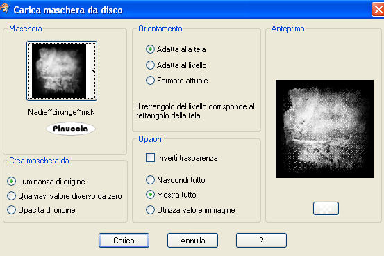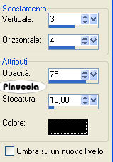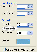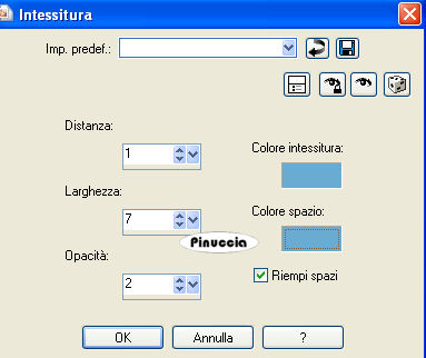 qui puoi trovare qualche risposta ai tuoi dubbi. Se l'argomento che ti interessa non è presente, ti prego di segnalarmelo. Questo tutorial è stato scritto in PSP X2, ma può essere eseguito anche con le altre versioni di PSP. Per tradurlo, l'ho eseguito con PSP X. Occorrente: Un tube a scelta. Il resto del materiale qui Lo scrapset è di TwinkyDezines Il tube che ho usato è di Lori Rhae. Metti la maschera nella cartella Maschere. Metti le selezioni nella cartella Selezioni. Metti i pennelli nella cartella Pennelli. Apri il font ScarletRibbons e minimizzalo nella tua area di lavoro. Lo troverai nella lista dei font disponibili quando ti servirà. Filtri: Graphics Plus qui Imposta il colore di primo piano con #69abd1, e il colore di sfondo con il bianco. 1. Apri una nuova immagine BIANCA 600 x 600 pixels. 2. Livelli>Nuovo livello raster. Riempi il livello con il colore di primo piano.3. Livelli>Carica/Salva maschera>Carica maschera da disco. Cerca e carica la maschera Nadia-Grunge-msk. ![]() Livelli>Elimina e rispondi sì alla domanda Unire la maschera nel livello corrente. ![]() Livelli>Unisci>Unisci gruppo. 4. Effetti>Plugins>Graphics Plus - Cross Shadow, con i settaggi standard. ![]() 5. Livelli>Nuovo livello raster. 6. Selezione>Carica/Salva selezione. Carica selezione da disco. Cerca e carica la selezione Days1-Vika. ![]() 7. Apri SD_SolidPaper1 by Twinky e vai a Modifica>copia. Torna al tuo lavoro e vai a Modifica>Incolla nella selezione. 8. Selezione>Deseleziona. 9. Effetti>Effetti 3D>Sfalsa ombra, con i seguenti settaggi: ![]() 10. Livelli>Nuovo livello raster. 11. Selezione>Carica/Salva selezione. Carica selezione da disco. Cerca e carica la selezione Days2-Vika. ![]() 12. Apri SD_SolidPaper2 by Twinky e vai a Modifica>copia. Torna al tuo lavoro e vai a Modifica>Incolla nella selezione. 13. Selezione>Deseleziona. 14. Effetti>Effetti 3D>Sfalsa ombra, con i settaggi precedenti. 15. Effetti>Effetti di trama>Intessitura, con i seguenti settaggi: colore intessitura e colore spazio con il colore di sfondo. ![]() 16. Apri SD_Flowerring by Twinky, e vai a Modifica>Copia. Torna al tuo lavoro e vai a Modifica>incolla come nuovo livello. 17. Nella paletta dei livelli attiva il livello Gruppo Raster 1. 18. Apri SD_Swirl by Twinky2, e vai a Modifica>Copia. Torna al tuo lavoro e vai a Modifica>Incolla come nuovo livello. Spostalo a destra.per vedere meglio il livello, nascosto dai livelli superiori, puoi momentaneamente togliere la visibilità a questi ultimi, oppure attivare lo strumento Puntatore per far apparire la griglia attorno al tube.![]() 19. Apri SD_Swirl by Twinky1, e vai a Modifica>Copia. Torna al tuo lavoro e vai a Modifica>Incolla come nuovo livello. Spostalo a sinistra.20. Livelli>Nuovo livello raster. 21. Attiva lo strumento Pennello ![]() cerca e seleziona il pennello brush.mallu.fumaça5, e applicalo in basso con il colore di primo piano. 22. Cerca e seleziona il pennello !LaBellaDiablo_Floral Outline, e applicalo a sinistra e a destra con il colore di primo piano. ![]() 23. Attiva il livello superiore (raster 3). 24. Apri V~DaisyBlues, e vai a Modifica>copia. Torna al tuo lavoro e vai a Modifica>Incolla come nuovo livello. Spostalo in basso a destra.25. Apri il tuo tube e vai a Modifica>Copia. Torna al tuo lavoro e vai a Modifica>Incolla come nuovo livello. Spostalo in basso.26. Effetti>Effetti 3D>Sfalsa ombra: ![]() 27. Apri Butterfly 1 e 2. Modifica>Copia e Modifica>Incolla come nuovo livello. Ripeti per aggiungere altre farfalle, e posizionale come preferisci.28. Inverti i colori di primo piano e sfondo. 29. Attiva lo strumento Testo , font ScarletRibbons, con i seguenti settaggi:![]() 30. Livelli>Converti in livello raster. Effetti>Effetti 3D>sfalsa ombra: ![]() 31. Aggiungi il tuo nome e/o il tuo watermark. 32. Livelli>Unisci>Unisci tutto e salva in formato jpg. ![]() ![]() Se hai problemi o dubbi, o trovi un link non funzionante, o anche soltanto per un saluto, scrivimi. 18 Ottobre 2008 |