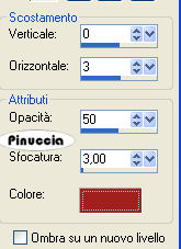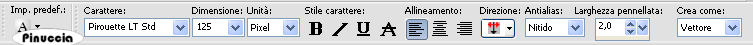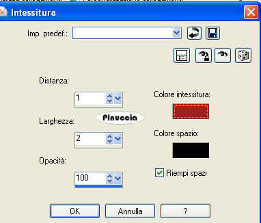 qui puoi trovare qualche risposta ai tuoi dubbi. Se l'argomento che ti interessa non è presente, ti prego di segnalarmelo. Questo tutorial è stato scritto in PSP X2, ma può essere eseguito anche con le altre versioni di PSP. Per tradurlo, l'ho eseguito con PSP X. Occorrente: Materiale qui Metti la maschera nella cartella Maschere. Importa il pennello ©M&M Floral-030. Come fare vedi qui Apri il font Pirouette e minimizzalo. Lo troverai nella lista dei font disponibili, quando ti servirà. Gli elementi scrap sono di http://www.retrodiva.netTracy Collins . Imposta il colore di primo piano con #a11f1d, e il colore di sfondo con il nero (#000000). 1. Apri una nuova immagine BIANCA 600 x 600 pixels. 2. Livelli>Nuovo livello raster. Riempi questo livello con il colore di primo piano.3. Livelli>Carica/Salva maschera>Carica maschera da disco. Cerca e carica la maschera montiblindsmask 1, con i seguenti settaggi: ![]() Livelli>Elimina, e rispondi sì alla domanda Unire la maschera nel livello corrente: ![]() Livelli>Unisci>Unisci gruppo. 4. Effetti>Effetti di trama>Intessitura, colore intessitura colore di primo piano, colore spazio nero: ![]() 5. Apri il tube TCO_DSF_NoRoomforGrey_frame, e vai a Modifica>Copia. Torna al tuo lavoro e vai a Modifica>Incolla come nuovo livello. Sposta la cornice un po' più in alto.6. Effetti>Effetti 3D>Sfalsa ombra: ![]() 7. Nella paletta dei livelli attiva il livello Gruppo-Raster 1 (il livello della maschera). 8. Livelli>Nuovo livello raster. 9. Attiva lo strumento Selezione a mano libera , da punto a punto:![]() e traccia una selezione intorno alla cornice. ![]() Riempi la selezione con il colore di primo piano.10. Effetti>Effetti di trama>Intessitura, con i settaggi precedenti. Selezione>Deseleziona. 11. Apri il tube JOB-Candy Ass -1-1-06. Nella paletta dei livelli attiva il livello del tube e vai a Modifica>Copia. Torna al tuo lavoro e vai a Modifica>Incolla come nuovo livello. Sposta il tube nella cornice.12. Nella paletta dei livelli attiva il livello gruppo-raster 1 (il livello della maschera). 13. Livelli>Nuovo livello raster. 14. Attiva lo strumento Pennello ![]() cerca e seleziona il pennello @M&M_Floral-030, e applicalo, cliccando con il tasto destro del mouse per usare il colore di sfondo (nero), nell'angolo in alto a sinistra della cornice. fai attenzione: il pennello inizia con il segno @; per questo lo troverai all'inizio della lista, prima dell'elenco alfabetico. ![]() Livelli>Nuovo livello raster. Applica nuovamente il pennello cliccando con il tasto sinistro del mouse per usare il colore di primo piano. Immagine>Ruota per gradi - 45 gradi a sinistra: ![]() ![]() 16. Nella paletta dei livelli attiva il livello superiore: Raster 1. 17. Apri il tube TCO DSF NoRoomforGrey bow 1, e vai a Modifica>Copia. Torna al tuo lavoro e vai a Modifica>Incolla come nuovo livello. Sposta il tube nell'angolo in alto a sinistra della cornice, vedi il mio esempio.18. Effetti>Effetti 3D>Sfalsa ombra: ![]() 19. Apri il tube TCO DSF NoRoomforGrey flower red, e vai a Modifica>Copia. Torna al tuo lavoro e vai a Modifica>Incolla come nuovo livello. Sposta il tube nell'angolo in basso a destra della cornice, vedi il mio esempio.20. Effetti>Effetti 3d>Sfalsa ombra con i settaggi precedenti. 21. Attiva lo strumento Testo , font Pirouette:![]() Chiudi il colore di primo piano e scrivi "Let it be" e "Sexy". Livelli>Converti in livello raster. 22. Effetti>Effetti 3D>Sfalsa ombra, con i seguenti settaggi, colore di primo piano: ![]() 23. Livelli>Unisci>Unisci tutto. 24. Aggiungi il tuo nome e/o il tuo watermark e salva in formato jpg. ![]() Le vostre versioni. Grazie ![]() Angela ![]() Se hai problemi o dubbi, o trovi un link non funzionante, o anche soltanto per un saluto, scrivimi. 2 Febbraio 2008 |