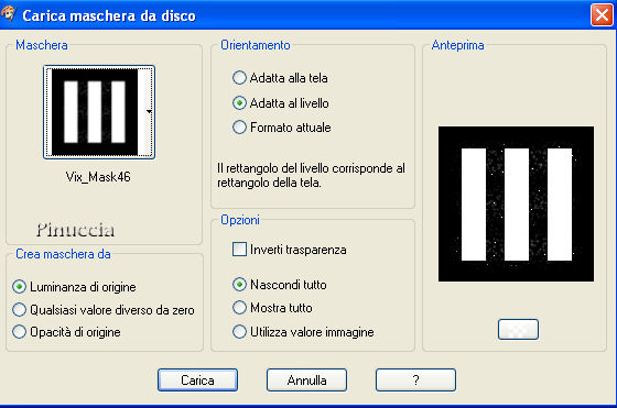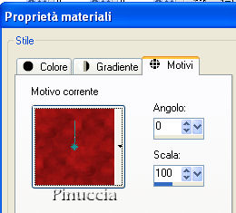 qui puoi trovare qualche risposta ai tuoi dubbi. Se l'argomento che ti interessa non è presente, ti prego di segnalarmelo. Questo tutorial è stato scritto in PSP X2, ma può essere eseguito anche con le altre versioni di PSP. Per tradurlo, l'ho eseguito con PSP X. Occorrente: Un tube a scelta. Il resto del materiale qui I tubes che ho usato sono di Jet e di Yoka . Metti la maschera nella cartella Maschere. Metti il pennello nella cartella Pennelli. Apri il motivo Red Patton e minimizzalo nella tua area di lavoro. Lo troverai nella lista dei motivi disponibili, quando ti servirà. 1. Apri una nuova immagine BIANCA 600 x 600 pixels. 2. Imposta il colore di primo piano sul nero. Imposta il colore di sfondo su Motivi. Apri il menu cliccando sulla freccia a fianco del box e seleziona il motivo Red Pattern. ![]() ![]() 3. Livelli>Nuovo livello raster. 4. Riempi con il motivo.ricorda che, per riempire con il colore di sfondo, devi cliccare con il tasto destro del mouse. 5. Livelli>Carica/Salva maschera>Carica maschera da disco. Cerca e carica la maschera Vix_Mask 46 ![]() Livelli>Elimina, e rispondi sì alla domanda Unire la maschera nel livello corrente. ![]() Livelli>Unisci>Unisci gruppo. 6. Attiva lo strumento gomma ![]() e cancella la striscia centrale della maschera: ![]() 7. Apri kerstkrans-Vika, e vai a Modifica>Copia. Torna al tuo lavoro e vai a Modifica>Incolla come nuovo livello. 8. Apri Victorian Christmas, e vai a Modifica>copia. Torna al tuo lavoro e vai a Modifica>Incolla come nuovo livello. 9. Livelli>Disponi>Sposta giù. 10. Attiva lo strumento gomma ,e cancella le tracce del tube all'esterno della decorazione. ![]() 11. Nella paletta dei livelli attiva il livello Raster 1. 12. Apri il tube che hai scelto e vai a Modifica>Copia. Torna al tuo lavoro e vai a Modifica>Incolla come nuovo livello. Spostalo a destra.13. Effetti>Effetti 3D>Sfalsa ombra: ![]() 14. Apri Clarey_hollyjolly_giftribbon 1, e vai a Modifica>copia. 15. Immagine>Ridimensiona, all'85%, tutti i livelli non selezionato. 16. Modifica>Copia. Torna al tuo lavoro e vai a Modifica>Incolla come nuovo livello. 17. Immagine>Ruota per gradi, 45 gradi a sinistra: ![]() Sposta il nastro nell'angolo in alto a sinistra.18. Effetti>Effetti 3D>Sfalsa ombra: ![]() 19. Attiva lo strumento Pennello ![]() cerca e seleziona il pennello agiBrush 82 merryxmas, e applicalo in basso a sinistra cliccando con il tasto sinistro del mouse, per usare il colore nero di primo piano. 20. Livelli>Unisci>Unisci tutto. 21. Immagine>Aggiungi bordatura, 1 pixel, simmetriche, con il colore nero. Immagine>Aggiungi bordatura, 25 pixels, simmetriche, con il colore bianco. Seleziona il bordo bianco con la bacchetta magica ![]() ![]() Riempi il bordo con il motivo.Selezione>Deseleziona. Immagine>Aggiungi bordatura, 1 pixel, simmetriche, con il colore nero. 22. Aggiungi il tuo nome e/o il tuo watermark, e salva in formato jpg. ![]() ![]() Se hai problemi o dubbi, o trovi un link non funzionante, o anche soltanto per un saluto, scrivimi 17 Dicembre 2007 |
