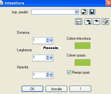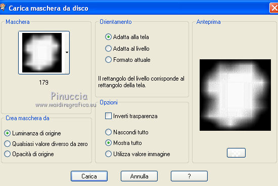 qui puoi trovare qualche risposta ai tuoi dubbi. Se l'argomento che ti interessa non è presente, ti prego di segnalarmelo. Questo tutorial è stato scritto in PSP X2, ma può essere eseguito anche con le altre versioni di PSP. Per tradurlo, l'ho eseguito con PSP X. Occorrente: Un tube a scelta. Il resto del materiale qui Metti la maschera nella cartella Maschere. Apri il font Abracadabra e minimizzalo. Lo troverai nella lista dei font disponibili, quando ti servirà. Gli elementi scrap sono di Weescotslass. I tubes che ho usato sono di Sharlimar e Yoka. Imposta il colore di primo piano con #9bc344, e il colore di sfondo con #b1b1f3. 1. Apri una nuova immagine BIANCA 600 x 600 pixels. 2. Livelli>Nuovo livello raster. 3. Riempi il livello con il colore di sfondo.4. Livelli>Carica/Salva maschera>Carica maschera da disco. Cerca e carica la maschera 179: ![]() Livelli>Elimina e rispondi sì alla domanda Unire la maschera nel livello corrente. ![]() Livelli>Unisci>Unisci gruppo. 5. Apri WSL_Frame6 e vai a Modifica>Copia. 6. Torna al tuo lavoro e vai a Modifica>Incolla come nuovo livello. Sposta la cornice a sinistra.7. Apri KMILL_bkgd-7 e vai a Modifica>Copia. 8. Torna al tuo lavoro e vai a Modifica>Incolla come nuovo livello. 9. Livelli>Disponi>Sposta giù. 10. Sistema la carta nel cerchio della cornice.11. Attiva lo strumento Gomma ![]() e cancella la carta al di fuori della cornice. 12. Apri le altre carte e sistemale sotto le varie sezioni della cornice,cancellando poi quello che rimane al di fuori. Alla fine dovresti avere pressappoco questo: ![]() 13. Nella paletta dei livelli attiva il livello della maschera. 14. Apri KMILL_leafything e vai a Modifica>Copia. 15. Torna al tuo lavoro e vai a Modifica>Incolla come nuovo livello. Sposta la foglia a destra.16. Effetti>Effetti 3D>Sfalsa ombra, con il colore di sfondo: ![]() Ripeti ancora una volta l'Effetto Sfalsa ombra. 17. Livelli>Unisci>Unisci tutto. 18. Apri KMILL_ribboncrumpled-1 e vai a Modifica>Copia. 19. Torna al tuo lavoro e vai a Modifica>Incolla come nuovo livello. 20. Immagine>Ruota per gradi - 90 gradi a sinistra: ![]() Sposta il nastro a sinistra.21. Apri KMILL_flowergroup-2 e vai a Modifica>Copia. 22. Torna al tuo lavoro e vai a Modifica>Incolla come nuovo livello. 23. Effetti>Effetti 3d>Sfalsa ombra: ![]() 24. Livelli>Duplica. 25. Immagine>Rifletti. 26. Immagine>Ridimensiona, al 90%, tutti i livelli non selezinoato. Spostalo un po' più a destra.![]() 27. Apri il tuo tube e vai a Modifica>Copia. 28. Torna al tuo lavoro e vai a Modifica>Incolla come nuovo livello. 29. Effetti>Effetti 3D>Sfalsa ombra: ![]() 30. Imposta il colore di sfondo con il bianco. 31. Attiva lo strumento Testo font Abracadabra:![]() Scrivi "The Naked Truth". 32. Livelli>Converti in livello raster. 33. Effetti>Effetti di trama>Intessitura: ![]() 34. Effetti>Effetti 3D>Sfalsa ombra: ![]() 35. Aggiungi il tuo nome e/o il tuo watermark. 36. Livelli>Unisci>Unisci tutto e salva. ![]() ![]() Se hai problemi o dubbi, o trovi un link non funzionante, o anche soltanto per un saluto, scrivimi 1 Agosto 2008 |