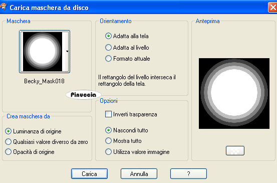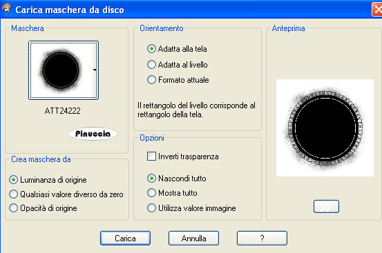 qui puoi trovare qualche risposta ai tuoi dubbi. Se l'argomento che ti interessa non è presente, ti prego di segnalarmelo. Questo tutorial è stato scritto in PSP X2, ma può essere eseguito anche con le altre versioni di PSP. Per tradurlo, l'ho eseguito con PSP X. Occorrente: Un tube a scelta. Il resto del materiale qui Il tube che ho usato è di Didier. Metti le maschere nella cartella Maschere. Imposta il colore di primo piano con #d46d30, e il colore di sfondo con il nero. 1. Apri una nuova immagine NERA 600 x 600 pixels. 2. Livelli>Nuovo livello raster. Riempi questo livello con il colore di primo piano.3. Livelli>Carica/Salva maschera>Carica maschera da disco. Cerca e carica la maschera masker ATT24222: ![]() Livelli>Elimina, e rispondi sì alla domanda Unire la maschera nel livello corrente: ![]() Livelli>Unisci>Unisci gruppo. 4. Livelli>Carica/Salva maschera>Carica maschera da disco. Cerca e carica la maschera masker Becky_Mask 018: ![]() Livelli>Elimina, e rispondi sì alla domanda Unire la maschera nel livello corrente: ![]() Livelli>Unisci>Unisci gruppo. Sposta il cerchio un po' più in basso.5. Attiva lo strumento Bacchetta magica ![]() e clicca all'interno del cerchio per selezionarlo. 6. Apri il tuo tube. Ridimensionalo (Immagine>Ridimensiona) un paio di volte al 115%, in modo che abbia approssimativamente le dimensioni del cerchio. 7. Immagine>Rifletti. 8. Modifica>Copia. Torna al tuo lavoro e vai a Modifica>Incolla come nuovo livello. 9. Selezione>Inverti. Premi sulla tastiera il tasto CANC ![]() 10. Selezione>Deseleziona. 11. Abbassa l'opacità di questo livello al 50%. 12. Livelli>Unisci>Unisci tutto. 13. Immagine>Aggiungi bordatura, 50 pixels, simmetriche, con il colore nero. 14. Livelli>Carica/Salva maschera>Carica maschera da disco. Cerca e carica la maschera masker dsmk 0007: ![]() Livelli>Elimina, e rispondi sì alla domanda Unire la maschera nel livello corrente: ![]() Livelli>Unisci>Unisci gruppo. 15. Livelli>Nuovo livello raster. 16. Riempi il livello con il colore di primo piano.17. Livelli>Disponi>Sposta giù. 18. Effetti>Effetti di trama>Trama - seleziona la trama Ciottoli, con i seguenti settaggi: ![]() 19. Nella paletta dei livelli attiva il livello Gruppo-Raster 1. 20. Apri il tube spiderweb, e vai a Modifica>Copia. 21. Torna al tuo lavoro e vai a Modifica>Incolla come nuovo livello. Sposta il tube in alto a sinistra.22. Apri il tube scary beauty-Vika, e vai a Modifica>Copia. 23. Torna al tuo lavoro e vai a Modifica>Incolla come nuovo livello. 24. Immagine>Ruota per gradi - 10 gradi a sinistra, tutti i livelli non selezionato. ![]() Sposta il tube in basso a sinistra.25. Apri il tube ARACHNOPHOBIA. 26. Attiva lo strumento Selezione ,scegli un ragno e traccia una selezione intorno a questo ragno. 27. Modifica>Copia. Torna al tuo lavoro e vai a Modifica>Incolla come nuovo livello. Torna al tube per scegliere un altro ragno; prima di selezionare il nuovo ragno, non dimenticare di deselezionare il precedente. 28. Apri il tuo tube e vai a Modifica>Copia. Torna al tuo lavoro e vai a Modifica>Incolla come nuovo livello. Sposta il tube a destra.29. Livelli>Unisci>Unisci tutto. 30. Immagine>Aggiungi bordatura, 10 pixels, simmetriche, con il colore nero. 31. Aggiungi il tuo nome e/o il tuo watermark e salva in formato jpg. ![]() Se hai problemi o dubbi, o trovi un link non funzionante, o anche soltanto per un saluto, scrivimi 2 Febbraio 2008 |