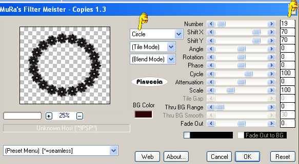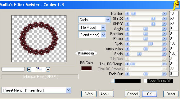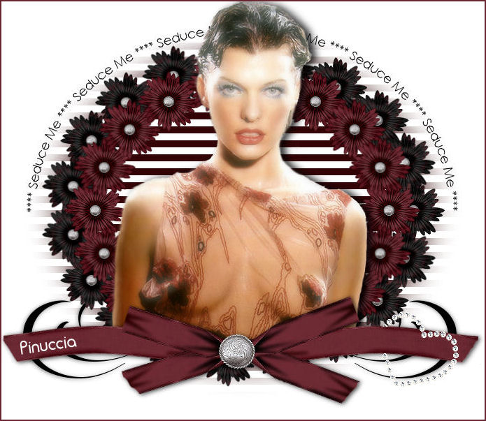 qui puoi trovare qualche risposta ai tuoi dubbi. Se l'argomento che ti interessa non è presente, ti prego di segnalarmelo. Questo tutorial è stato scritto in PSP X2, ma può essere eseguito anche con le altre versioni di PSP. Per tradurlo, l'ho eseguito con PSP X. Occorrente: Un tube a scelta. I tubes che ho usato per i miei esempi sono di Gini, Marcio e Filly. Il materiale scrap è di Lisa Materiale qui Filtro: Mura's Meister - Copies qui Metti la Maschera nella cartella Maschere. Metti il pennello nella cartella Pennelli. Se hai problemi con i pennelli vedi alcuni appunti qui Imposta il colore di primo piano con il nero, e il colore di sfondo con #330405. 1. Apri una nuova immagine BIANCA 700 x 600 pixels. 2. Livelli>Nuovo livello raster. Riempi questo livello con il colore di sfondo.ricorda che, per riempire con il colore di sfondo, devi cliccare con il tasto destro del mouse. 3. Livelli>Carica/Salva maschera>Carica maschera da disco: cerca e carica la maschera montiblindsmask 1: ![]() Livelli>Elimina, e rispondi sì alla domanda Unire la maschera nel livello corrente: ![]() Livelli>Unisci>Unisci gruppo. 4. Apri SS-Pinked-Flower 5. 5. Immagine>Ridimensiona, al 75%, tutti i livelli, e ripeti 3 volte (quindi, in totale, 4 volte). 6. Modifica>Copia. Torna al tuo lavoro e vai a Modifica>Incolla come nuovo livello. 7. Effetti>Plugins>Mura's Meister - Copies. ![]() 8. Apri SS-Pinked-Flower 4. 9. Ripeti il punto 5. 10. Modifica>Copia. Torna al tuo lavoro e vai a Modifica>Incolla come nuovo livello. 11. Effetti>Plugins>Mura's Meister - Copies ![]() 12. Apri seduced me-txt-Vika e vai a Modifica>Copia. 13. Torna al tuo lavoro e vai a Modifica>Incolla come nuovo livello. Sposta il testo sopra i fiori.14. Apri il tuo tube, e vai a Modifica>Copia. Torna al tuo lavoro e vai a Modifica>Incolla come nuovo livello. Effetti>Effetti 3d>Sfalsa ombra, con i seguenti settaggi: ![]() Ripeti l'Effetto Sfalsa ombra, con i seguenti settaggi. ![]() 17. Apri SS-Pinked-Ribbon Wrap 2. 18. Immagine>Ridimensiona, all'85%, tutti i livelli non selezionato, per due volte. 19. Modifica>Copia. Torna al tuo lavoro e vai a Modifica>Incolla come nuovo livello. Sposta il nastro in basso.20. Attiva lo strumento Gomma ![]() e cancella le estremità del nastro. ![]() ![]() 21. Effetti>Effetti 3D>Sfalsa ombra: ![]() 22. Nella paletta dei livelli attiva il livello Gruppo-raster 1. 23. Livelli>Nuovo livello raster. 24. Attiva lo strumento Pennello ![]() cerca e seleziona il pennello hbg 2003 004, (attenzione alla rotazione!). ![]() 25. Applica il pennello a sinistra del nastro con il colore di primo piano. 26. Livelli>Duplica. 27. Immagine>Rifletti. 28. Nella paletta dei livelli attiva il livello Raster 5. 29. Apri Tushhart. 30. Immagine>Ridimensiona, al 70%, tutti i livelli non selezionato. 31. Modifica>Copia. Torna al tuo lavoro e vai a Modifica>Incolla come nuovo livello. Sposta il cuore a destra del nastro.32. Effetti>Effetti 3D>Sfalsa ombra: ![]() 33. Attiva lo strumento Gomma ![]() e cancella il pezzetto del cuore, per dare l'impressione che sia infilato nel nastro. ![]() ![]() 34. Livelli>Unisci>Unisci tutto. 35. Aggiungi il tuo nome e salva in formato jpg. ![]() ![]() ![]() Se hai problemi o dubbi, o trovi un link non funzionante, o anche soltanto per un saluto, scrivimi 14 Gennaio 2008 |