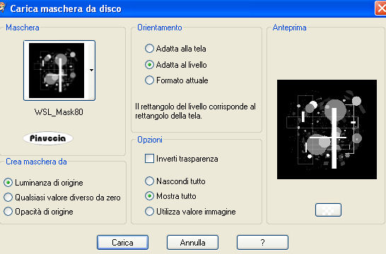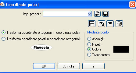 qui puoi trovare qualche risposta ai tuoi dubbi. Se l'argomento che ti interessa non è presente, ti prego di segnalarmelo. Questo tutorial è stato scritto in PSP X2, ma può essere eseguito anche con le altre versioni di PSP. Per tradurlo, l'ho eseguito con PSP X. Occorrente: Un tube a scelta. Il resto del materiale qui Metti la maschera nella cartella Maschere. I tubes che ho usato per i miei esempi sono di Angie. Imposta il colore di primo piano con #c8e1e4, e il colore di sfondo con il nero. 1. Apri una nuova immagine BIANCA 600 x 600 pixels. 2. Livelli>Nuovo livello raster. 3. Attiva lo strumento Selezione ![]() clicca sull'icona selezione personalizzata ![]() e imposta i seguenti settaggi: ![]() 4. Riempi la selezione con il colore di sfondo.5. Selezione>Modifica>Contrai, 4 pixels. 6. Riempi la selezione con il colore di primo piano.7. Selezione>Modifica>Contrai - 4 pixels. Premi sulla tastiera il tasto CANC ![]() 8. Selezione>Modifica>Contrai - 4 pixels. 9. Riempi la selezione con il colore nero.10. Selezione>Deseleziona. 11. Effetti>Effetti di distorsione>Coordinate polari: ![]() 12. Livelli>Nuovo livello raster. 13. Riempi con il colore di primo piano.14. Livelli>Carica/salva maschera>Carica maschera da disco. Cerca e carica la maschera WSL_Mask80: ![]() Livelli>Elimina e rispondi sì alla domanda Unire la maschera nel livello corrente: ![]() Livelli>Unisci>Unisci gruppo. 15. Apri touch_me_tekst_Vika, e vai a Modifica>copia. Torna al tuo lavoro e vai a Modifica>Incolla come nuovo livello. Il testo è già correttamente posizionato. Non occorre spostarlo. 16. Apri il tuo tube e vai a Modifica>Copia. Torna al tuo lavoro e vai a Modifica>Incolla come nuovo livello. 17. Attiva lo strumento Gomma ![]() e cancella la parte di tube al di fuori del cerchio. 18. Livelli>Duplica. Livelli>Disponi>Sposta giù. 19. Effetti>Effetti di distorsione>Vento - da sinistra, intensità 75: ![]() Ripeti l'Effetto Vento, con gli stessi settaggi, da destra. 20. Aggiungi il tuo nome e/o il tuo watermark. 21. Livelli>Unisci>Unisci tutto e salva in formato jpg. ![]() ![]() Se hai problemi o dubbi, o trovi un link non funzionante, o anche soltanto per un saluto, scrivimi 2 Giugno 2008 |