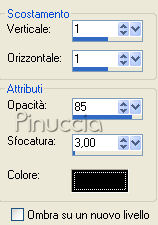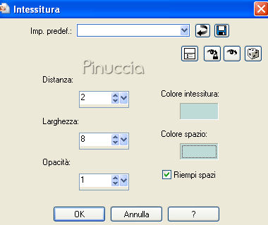 qui puoi trovare qualche risposta ai tuoi dubbi. Se l'argomento che ti interessa non è presente, ti prego di segnalarmelo. Questo tutorial è stato scritto in PSP X2, ma può essere eseguito anche con le altre versioni di PSP. Per tradurlo, l'ho eseguito con PSP X. Occorrente: Un tube a scelta. Il resto del materiale qui Metti la maschera nella cartella Maschere. Metti il pennello nella cartella Pennelli. Gli elementi scrap sono di Clarey Filtro Penta.com - Dot and cross qui Imposta il colore di primo piano con #c87f9a. Imposta il colore di sfondo con #bedbd7. 1. Apri una nuova immagine BIANCA 600 x 600 pixels. 2. Livelli>Nuovo livello raster. Riempi con il colore di sfondo.ricorda che, per riempire con il colore di sfondo, devi cliccare con il tasto destro del mouse. 3. Livelli>Carica/Salva maschera>Carica maschera da disco. Cerca e carica la maschera Gabee Valentine 1: ![]() Livelli>Elimina, e rispondi sì alla domanda Unire la maschera nel livello corrente: ![]() Livelli>Unisci>Unisci gruppo. 4. Effetti>Plugins>Penta.com - Dot and Cross: ![]() 5. Effetti>Effetti 3D>Sfalsa ombra, con i seguenti settaggi, colore nero: ![]() Ripeti l'Effetto Sfalsa ombra, ma cambiando verticale e orizzontale con -1. 6. Apri clarey_xoxo_roundframe1, e vai a Modifica>Copia. 7. Torna al tuo lavoro e vai a Modifica>Incolla come nuovo livello. Sposta la cornice al centro del cerchio.8. Effetti>Plugins>Penta.com - Dot and Cross, con i settaggi precedenti. 9. Livelli>Nuovo livello raster. 10. Attiva lo strumento Selezione , cerchio.11. Traccia un cerchio al centro della cornice. ![]() se il cerchio non è nella posizione corretta, non è necessario rifarlo, le selezioni si possono spostare tenendo premuto il tasto destro del mouse 12. Riempi la selezione con il colore di primo piano.13. Selezione>Deseleziona. 14. Livelli>Disponi>Sposta giù. 15. Effetti>Effetti di trama>Intessitura: ![]() 16. Immagine>Ruota per gradi, 45 gradi a sinistra: ![]() 17. Apri Scraptube 22 e vai a Modifica>Copia. 18. Torna al tuo lavoro e vai a Modifica>Incolla come nuovo livello. 19. Immagine>Ruota per gradi, 10 gradi a sinistra: ![]() 20. Attiva lo strumento Gomma ![]() e cancella le tracce dello scrap all'esterno della cornice. 22. Apri il tuo tube e vai a Modifica>Copia. Torna al tuo lavoro e vai a Modifica>Incolla come nuovo livello. Sposta il tube al centro del cerchio.23. Effetti>Effetti 3D>Sfalsa ombra, con i seguenti settaggi. ![]() Ripeti l'Effetto Sfalsa ombra con i seguenti settaggi: ![]() 24. Nella paletta dei livelli attiva il livello Raster 1. 25. Attiva nuovamente lo strumento Gomma ![]() e cancella la cornice sopra il tube: ![]() per queste operazioni, dovrai regolarti a seconda del tube che stai usando. 26. Attiva il livello di sfondo. 27. Livelli>Nuovo livello raster. 28. Attiva lo strumento Pennello ![]() Cerca e seleziona il pennello SFK_Texthg1, e applicalo con il colore di primo piano intorno alla cornice. 29. Attiva il livello Raster 1. 30. Apri Clarey_xoxo_bow1. Immagine>Ridimensiona, al 20%, tutti i livelli non selezionato. Modifica>Copia. 31. Torna al tuo lavoro e vai a Modifica>Incolla come nuovo livello. Sposta il nastro come nel mio esempio.32. Effetti>Effetti 3D>Sfalsa ombra, con i seguenti settaggi: ![]() Ripeti l'Effetto Sfalsa ombra, ma cambiando verticale e orizzontale con -1. 35. Livelli>Duplica, 3 volte, e disponi i nastrini come nel mio esempio.36. Attiva il livello Raster 6. 37. Apri clarey_xoxo_button6, e vai a Modifica>Copia. Torna al tuo lavoro e vai a Modifica>Incolla come nuovo livello. Sposta il bottone sul nastro della cornice.38. Livelli>Duplica. Immagine>Rifletti. 39. Livelli>Unisci>Unisci giù. 40. Effetti>Effetti 3D>Sfalsa ombra, con i settaggi precedenti. 41. Attiva il livello Raster 5. 42. Apri You and Me_tekst_Vika e vai a Modifica>Copia. Torna al tuo lavoro e vai a Modifica>Incolla come nuovo livello. Per poter spostare il testo più agevolmente, togli la visibilità al livello Gruppo Raster 1. Sposta il testo in alto.Rendi nuovamente visibile il livello Gruppo Raster 1. 43. Aggiungi il tuo nome e/o il tuo watermark. 44.Livelli>Unisci>Unisci tutto, e salva in formato jpg. ![]() ![]() Se hai problemi o dubbi, o trovi un link non funzionante, o anche soltanto per un saluto, scrivimi 19 Febbraio 2008 |