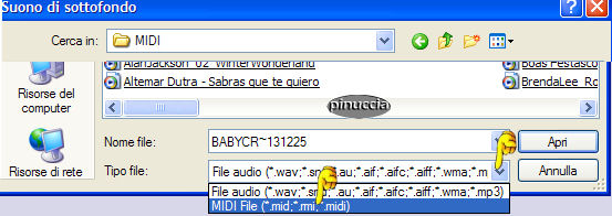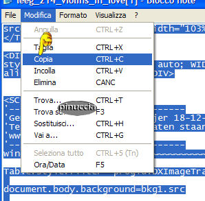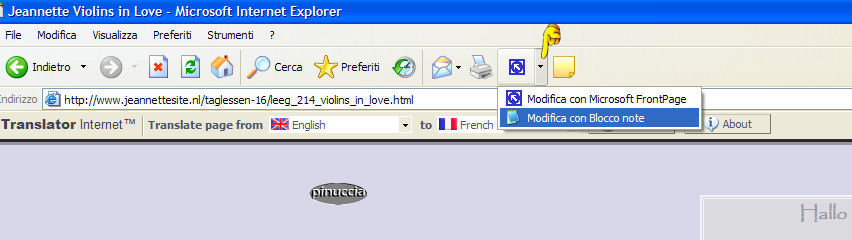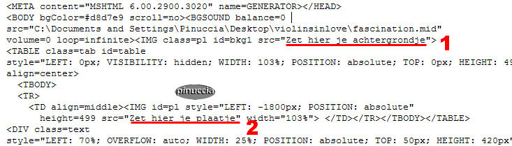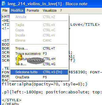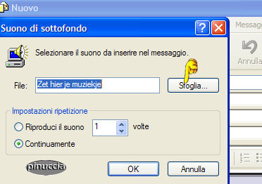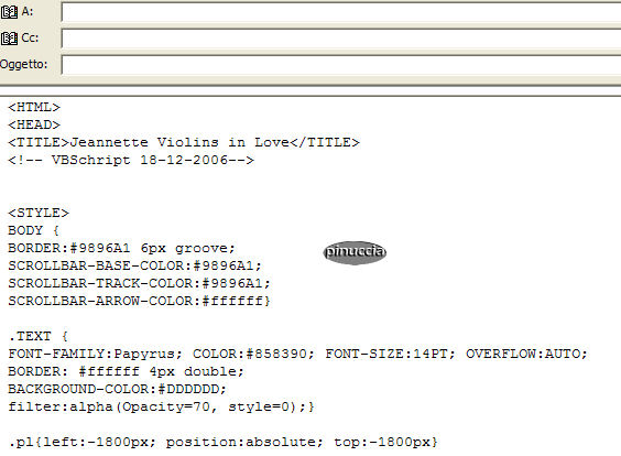 qui puoi trovare qualche risposta ai tuoi dubbi. Se l'argomento che ti interessa non è presente, ti prego di segnalarmelo. Materiale qui I bei tubes usati sono di Suzi Sgai e Marif. Filtri: Greg's Factory Output II qui Simple qui Imposta il colore di primo piano con #ffffff e il colore di sfondo con #e0e0e0. 1. Apri il tube con il violino, clicca con il tasto destro del mouse sul livello del watermark e scegli Elimina. 2. Immagine>Ridimensiona, a 250 pixels di altezza. Immagine>Rifletti. 3. Livelli>Nuovo livello raster. Riempi il nuovo livello con il colore di sfondo.4. Effetti>Plugins>Filters Unlimited: ![]() 5. Nella paletta dei livelli trascina questo livello sotto quello del tube. (Per eseguire questo passaggio puoi anche fare: Livelli>Disponi>Sposta sotto). 7. Livelli>Unisci>Unisci tutto. 8. Immagine>Aggiungi bordatura, 5 pixels, simmetriche, con il colore bianco. Seleziona il bordo con la bacchetta magica ![]() e riempilo con il colore di sfondo.9. Effetti>Plugins>Greg's Factory Output II - Poolshadow: ![]() 10. Selezione>Nessuna selezione. 11. Apri una nuova immagine, con il colore di sfondo #e0e0e0, 600 x 475 pixels. 12. Effetti>Plugins>Filter Unlimited, come al punto 4. 13. Apri l'immagine con il violino e vai a Modifica>Copia. Nell'immagine grande: Modifica>Incolla>Incolla come nuovo livello, e spostala a destra.14. Effetti>Effetti 3D>Sfalsa ombra: ![]() 15. Apri il tube della donna, clicca con il tasto destro del mouse sul livello del watermark e scegli elimina. 16. Immagine>Rifletti. 17. Modifica>Copia. Ritorna al tuo lavoro e vai a Modifica>Incolla>Incolla come nuovo livello. Spostalo a destra.18. Livelli>Unisci>Unisci tutto. 19. Immagine>Aggiungi bordatura, 5 pixels, simmetriche, con il colore bianco #ffffff. Seleziona il bordo con la bacchetta magica ![]() e riempilo con il colore di sfondo (#e0e0e0).20. Effetti>Plugins>Greg's Factory Output II, PoolShadow, come al punto 9. 21. Immagine>Aggiungi bordatura, 1 pixels, simmetriche, con il colore di sfondo (#e0e0e0). 22. Immagine>Aggiungi bordatura, simmetriche non selezionato, con il colore bianco (#ffffff): ![]() 23. Seleziona la parte bianca con la bacchetta magica ![]() 24. Effetti>Plugins>Simple - Centre Tile. 25. Livelli>Nuovo livello raster. Riempi il nuovo livello con il colore di sfondo (#e0e0e0).26. Abbassa l'opacità di questo livello al 50%. 27. Selezione>Inverti. Effetti>Effetti 3D>Sfalsa ombra: ![]() Ripeti l'Effetto Sfalsa ombra, ma cambiando verticale e orizzontale a -2. 28. Selezione>Nessuna selezione. Livelli>Unisci>Unisci tutto. 29. Immagine>Aggiungi bordatura, simmetriche non selezionato, con il colore nero (#000000): ![]() 30. Seleziona la parti nere con la bacchetta magica ![]() tenendo premuto il tasto Shift della tastiera. 31. Riempi la selezione con il colore di sfondo (#e0e0e0).32. Effetti>Plugins>Greg's Factory Output - Poolshadow, come al punto 9. Selezione>Nessuna selezione. 33. Attiva lo strumento Testo , scegli un bel font e scrivi il tuo testo.34. Effetti>Plugins>Greg's Factory Output II - Poolshadow come al punto 9. 35. Effetti>Effetti 3D>Sfalsa ombra: ![]() 36. Se tutto è andato bene, la tua immagine dovrebbe avere alta 499 pixels. Se non è così ridimensionala (Immagine>Ridimensiona....), a 499 pixels di altezza. L'immagine è finita. Se vuoi usarla in uno script devi creare uno sfondo. 37. Sfondo: Apri una nuova immagine con il colore di sfondo (#e0e0e0) 100x100 pixels. Effetti>Plugins>Filters Unlimited, come al punto 4. Salva in formato jpg. Se vuoi creare lo script clicca qui (il link non funziona perchè il sito è chiuso, ma lascio le istruzioni che possono servire per casi simili) Ti apparirà uno sfondo vuoto con la scritta Hallo. Clicca sul piccolo triangolo per aprire il menu corrispondente ai programmi di modifica. Seleziona "Modifica con Blocco note". ![]() Si aprirà la pagina con lo script. se nella tua versione di Internet Explorer non trovi questa icona, clicca su Pagina, e, nel menu a tendina che si aprirà, seleziona Modifica con blocco note. ![]() Vai a Modifica>Seleziona tutto: ![]() Lo scritto diventerà blu. Vai a Modifica>Copia. ![]() Puoi chiudere la schermata. Apri il tuo programma di posta e clicca su Crea messaggio. Io uso Outlook Express, quindi è con questo programma che illustrerò gli esempi. Sulla barra inferiore del messaggio dovrebbero esserci tre linguette: Modifica - Origine - Anteprima. Se non le vedi, vai a Modifica e spunta l'opzione "Visualizza>Modifica Origine". ![]() Clicca su Origine e avrai questo. ![]() Seleziona il testo ed eliminalo. Vai a Modifica>Incolla ed ecco lo script, che adesso dovrà essere elaborato. ![]() In questo script, gli elementi di cui hai bisogno sono: - un suono (facoltativo); - l'immagine principale del tutorial; - l'immagine di sfondo che hai creato alla fine del tutorial. (Ti consiglio, prima di tutto, di mettere i files necessari alla creazione di uno script nella stessa cartella). Comincia con la musica. Per inserire la musica, clicca sulla linguetta modifica. Vai a Formato>Sfondo>Suono: Apparirà questa finestra, con la scritta in olandese che vuol dire "Metti qui la musica". Clicca su Sfoglia, ![]() e cerca la cartella dove salvi i tuoi midi e scegli la musica di sottofondo. Se vuoi che il suono sia riprodotto in continuazione spunta "Continuamente". Se vuoi che sia riprodotto una o più volte, spunta "Riproduci il suono", scegliendo il numero di volte. Clicca ok e il percorso del file avrà sostituito la scritta preesistente. Un consiglio: usate file con estensione midi e non wav, perchè queste ultime appesantiscono moltissimo la mail. Pertanto, quando cercate il file, per prima cosa aprite il menu del formato, e selezionate "midi, ecc." ![]() Adesso devi indicare allo script dove trovare l'immagine principale e lo sfondo. Clicca sulla linguetta Origine e identifica i punti di inserimento: 1. per lo sfondo. 2. per l'immagine principale: ![]() (un consiglio: se hai messo i tre files nella stessa cartella, sarai faci