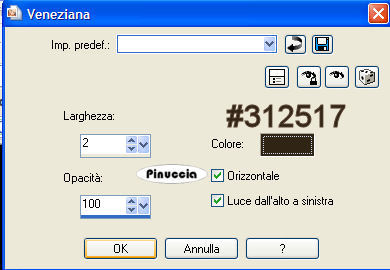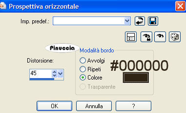 qui puoi trovare qualche risposta ai tuoi dubbi. Se l'argomento che ti interessa non è presente, ti prego di segnalarmelo. Occorrente: Materiale qui Tube, pennelli, template, selezioni. Filtro: Photo Aging Kit qui questo filtro si usa importato in Unlimited. Vedi qui Metti tutto il materiale nelle rispettive cartelle. Imposta il colore di primo piano con #574030, e il colore di sfondo con #312517. 1. Apri una nuova immagine trasparente 600 x 600 pixels, e riempila con il colore di sfondo.2. Livelli>Nuovo livello raster. 3. Selezione>Carica/Salva selezione>Carica selezione da disco. Cerca e carica la selezione Warned1-Vika. ![]() Riempi la selezione con il colore di primo piano.4. Effetti>Effetti di trama>Veneziana: ![]() 5. Effetti>Effetti 3D>Sfalsa ombra: ![]() Ripeti l'Effetto Sfalsa ombra, cambiando verticale in -4. 6. Selezione>Nessuna selezione. 7. Apri il template Believe In Angels KellyCDesign's 06. Nella paletta dei livelli attiva il livello "Template" e vai a Modifica>Copia. Torna al tuo lavoro e vai a Modifica>Incolla>Incolla come nuovo livello. Non occorre spostarlo. E' già correttamente posizionato. 8. Livelli>Unisci>Unisci tutto. 9. Effetti>Effetti geometrici>Prospettiva orizzontale: ![]() 10. Effetti>Plugins>Photo Aging Kit - dirt & dust, con i settaggi standard. ![]() 11. Apri il tube "Warned" e vai a Modifica>Copia. Torna al tuo lavoro e vai a Modifica>Incolla>Incolla come nuovo livello. Spostalo a destra.12. Livelli>Duplica. Nella paletta dei livelli attiva il livello Raster 1. 13. Effetti>Effetti di distorsione>Vento: ![]() Abbassa l'opacità di questo livello al 38%. 14. Livelli>Unisci>Unisci tutto. 15. Immagine>Aggiungi bordatura, simmetriche non selezionato: ![]() 16. Livelli>Nuovo livello raster. 17. Selezione>Carica/Salva selezione>Carica selezione da disco. Cerca e carica la selezione Warned2-Vika: ![]() Riempi la selezione con il colore di primo piano.18. Effetti>Plugins>Filters Unlimited - Photo Aging Kit - dirt & dust, con i settaggi standard. 19. Selezione>Nessuna selezione. 20 Livelli>Nuovo livello raster. Imposta il colore di sfondo con il nero. 21. Attiva lo strumento Pennello ![]() cerca e seleziona il pennello 100% BITCH, e clicca con il tasto destro del mouse per applicarlo con il colore di sfondo. Immagine>Ruota>Ruota per gradi, 90 gradi a sinistra. ![]() Spostalo nella striscia a sinistra.22. Livelli>Nuovo livello raster. Cerca e seleziona il pennello Crazy-Goth-Sayings2, e clicca con il tasto destro del mouse per applicarlo con il colore di sfondo. Sposta il pennello come nel mio esempio.23. Imposta il colore di primo piano con #c2ac95. Attiva lo strumento Penna ,![]() e traccia due linee ai lati della striscia. ![]() io ho impostato "crea su vettore", perchè in questo modo, dopo aver convertito la linea in livello raster, posso comodamente spostarla per sistemarla meglio. Se segui il mio esempio, non ti occorre tracciare la seconda striscia. Sarà sufficiente duplicare il livello e spostarla sull'altro lato. 24. Livelli>Unisci>Unisci tutto. 25. Immagine>Aggiungi bordatura, 1 pixel, simmetriche, con il colore di primo piano. Immagine>Aggiungi bordatura, 5 pixels, simmetriche, con il colore nero. Immagine>Aggiungi bordatura, 1 pixel, simmetriche, con il colore di primo piano. 26. Aggiungi il tuo nome e/o il tuo watermark e salva in formato jpg. ![]() Se hai problemi o dubbi, o trovi un link non funzionante, o anche soltanto per un saluto, scrivimi 25 Agosto 2007 |