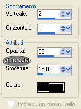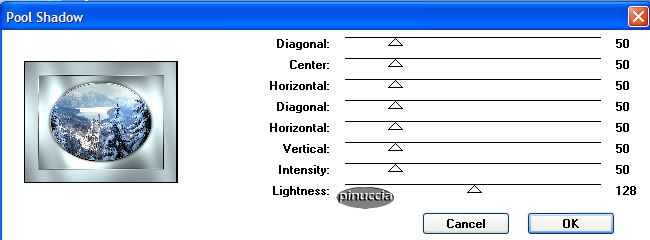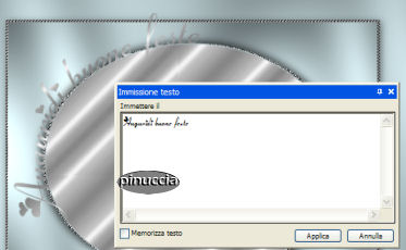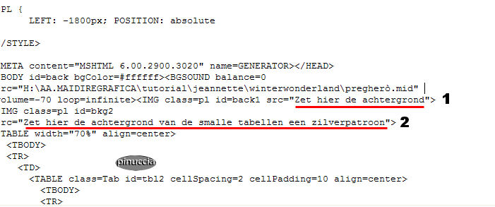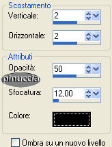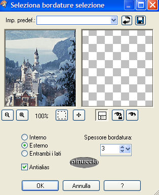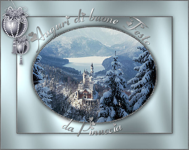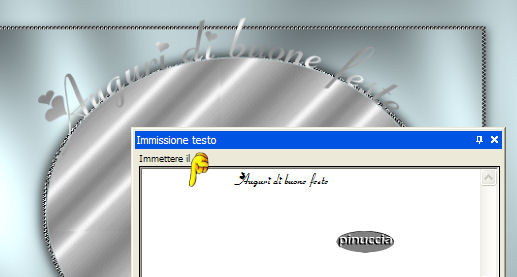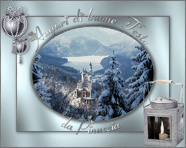 qui puoi trovare qualche risposta ai tuoi dubbi. Se l'argomento che ti interessa non è presente, ti prego di segnalarmelo. Materiale qui Non aprire la lanterna in PSP, è una animazione, che ti servirà - se vorrai realizzarlo - per lo script. Il tube della lanterna è di Margit. Filtro: Greg's Factory Output II qui Screenworks qui Imposta il colore di primo piano con #B9CCD0, e il colore di sfondo con un motivo argento. 1. Apri l'immagine "Winterwonderland". 2. Clicca con la bacchetta magica sulla parte esterna all'immagine.Selezione>Inverti. 3. Selezione>Modifica>Seleziona bordature selezione: ![]() 5. Effetti>Plugins>Screenworks - Close Knit. Regola>Messa a fuoco>Metti a fuoco, 2 volte. Selezione>Nessuna selezione. 6. Livelli>Unisci>Unisci visibile. 7. Livelli>Nuovo livello raster. Riempi con il colore di primo piano.8. Effetti>Plugins>Greg's Factory Output - Poolshadow: ![]() 9. Nella paletta dei livelli posizionati sul livello inferiore. Livelli>Disponi>Sposta in alto. 10. Effetti>Effetti 3D>Sfalsa ombra: ![]() Ripeti l'Effetto Sfalsa ombra, ma cambiando verticale e orizzontale a -2. 11. Livelli>Unisci>Unisci tutto. 12. Immagine>Aggiungi bordatura, 3 pixels, simmetriche, con il colore nero (#000000). Seleziona il bordo con la bacchetta magica ![]() e riempilo con il Motivo argento.(Ricorda che il Motivo argento è impostato come colore di sfondo, quindi per riempire la selezione devi cliccare con il tasto destro del mouse). 13. Effetti>Plugins>Screenworks - Close Knit. Regola>Messa a fuoco>Metti a fuoco, 2 volte. Selezione>Nessuna selezione. 14. Immagine>Aggiungi bordatura, 50 pixels, simmetriche, con il colore di primo piano (#b9ccd0). Seleziona il bordo con la bacchetta magica ![]() 15. Effetti>Plugins>Greg's Factory - Poolshadow: ![]() 16. Selezione>Inverti. 17. Effetti>Effetti 3D>Sfalsa ombra: ![]() Selezione>Nessuna selezione. 18. Immagine>Aggiungi bordatura, 3 pixels, simmetriche, con il colore nero (#000000). Seleziona il bordo con la bacchetta magica ![]() e riempilo con il Motivo argento.(Ricorda che il Motivo argento è impostato come colore di sfondo, quindi per riempire la selezione devi cliccare con il tasto destro del mouse). Effetti>Plugins>Screenworks - Close Knit. Regola>Messa a fuoco>Metti a fuoco, 2 volte. Selezione>Nessuna selezione. 19. Apri il file "Vectorlaag" e vai a Modifica>Copia. Torna al tuo lavoro e vai a Modifica>Incolla>Incolla come nuovo livello. 20. Lascialo come sta (ti serve per scrivere il testo); più tardi lo eliminerai. 21. Attiva lo strumento Testo e vedrai apparire la griglia vettoriale.![]() 22. Chiudi il colore di primo piano e scegli un bel font. 23. Muovi il mouse sui nodi vettori e, quando vedrai apparire una A arrotondata ![]() scrivi il tuo testo. 24. Non lo vedrai esattamente al centro: ![]() 25. Per centrare il testo, posizionati davanti alla scritta e clicca la barra spaziatrice, finchè non vedrai il testo perfettamente al centro. ![]() 26. Effetti>Effetti 3D>Sfalsa ombra: ![]() 27. Selezione>Nessuna selezione. 28. Nella paletta dei livelli chiudi il livello vettore. ![]() 29. Livelli>Unisci>Unisci visibile. 30. Rendi nuovamente visibile il livello vettore. 31. Nella paletta dei livelli sposta il livello vettore in alto. 32. Immagine>Capovolgi. 33. Scrivi il tuo nome ed eventualmente aggiungi degli spazi, come hai fatto con il primo testo, per centrarlo perfettamente. 34. Effetti>Effetti 3D>Sfalsa ombra: ![]() Selezione>Nessuna selezione. 35. Nella paletta dei livelli clicca con il tasto destro del mouse sul livello vettore e scegli Elimina. 36. Posizionati sul livello superiore e sposta il testo un po' più in basso.37. Livelli>Unisci>Unisci visibile. 38. Attiva il tube della palla di natale "Kerstbal" e vai a Modifica>copia. Torna al tuo lavoro e vai a Modifica>Incolla>Incolla come nuovo livello. Spostala nell'angolo in alto a sinistra.Effetti>Effetti 3D>Sfalsa ombra: ![]() 39. Ritorna al tube della palla di natale. Immagine>Ridimensiona a 125 pixels di altezza. Modifica>Copia. 40. Torna al tuo lavoro e vai a Modifica>Incolla>Incolla come nuovo livello. Effetti>Effetti 3D>Sfalsa ombra: ![]() 41. Nella paletta dei livelli sposta questo livello sotto il livello della pallina più grande. 42. Livelli>Unisci>Unisci tutto. L'immagine è finita. ![]() ![]() Per usare lo script di Jeannette clicca qui (ho tolto il link perchè il sito è chiuso, ma lascio le istruzioni che possono essere utili per casi simili) e segui i preliminari descritti alla fine di questo tutorial, fino all'inserimento dello sfondo-suono. Dopo aver inserito lo sfondo-suono, dovrai indicare allo script dove trovare le immagini. Clicca sulla linguetta Origine e identifica i punti di inserimento. (se hai messo i files nella stessa cartella, sarai facilitato dal fatto che, dopo aver inserito la musica, da questa potrai ricavare il percorso degli altri files, cambiando soltanto la parte finale, nomefile.estensione) I files necessari per lo script sono: la gif della lanterna (nello zip) la tag che hai appena creato, uno sfondo a tinta unita, uno sfondo argento. Nella schermata sotto, sono indicati i punti di inserimento dei files dello script. Devi cancellare la scritta tra le virgolette e inserire il tuo percorso: 1=qui inserisci lo sfondo colorato.