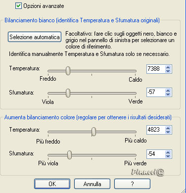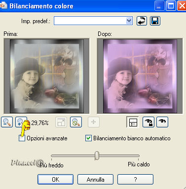 del tube scompaia dal davanzale (vedi come esempio la tag finale)Nella paletta dei livelli abbassa l'opacità al 60%. 15. Effetti>Plugins>FM Tile Tools/Blend Emboss, con i settaggi standard. 16. Livelli>Unisci>Unisci tutto. 17. Immagine>Aggiungi bordatura, 2 pixels, simmetriche, con il colore nero. 18. Regola>Correzione fotografica>Rimozione disturbo fotocamera digitale. 19. Il prossimo passaggio non si trova in PSP 8 o 9, ma puoi anche saltarlo e usare un altro filtro per regolare il bilanciamento del colore. 20. Regola>Bilanciamento colore / clicca su Opzioni avanzate, ![]() con i seguenti settaggi: ![]() 21. Effetti>Plugins>Xero - Porcelain ![]() 22. Aggiungi il tuo watermark e riduci l'immagine a 400 pixels.