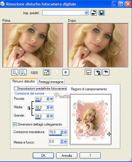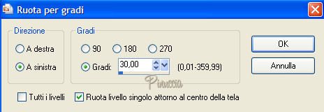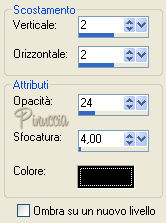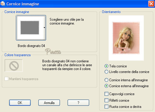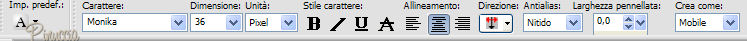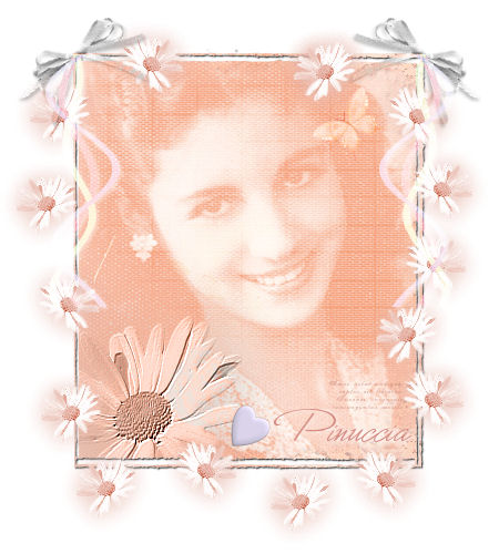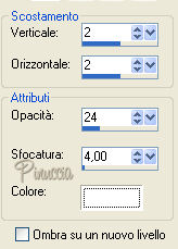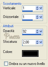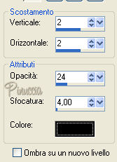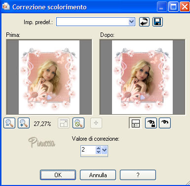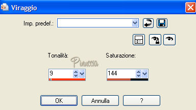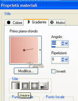 qui puoi trovare qualche risposta ai tuoi dubbi. Se l'argomento che ti interessa non è presente, ti prego di segnalarmelo. Questo tutorial è stato scritto in PSP XI, ma può essere eseguito con qualsiasi versione del programma. Per tradurlo, l'ho eseguito con PSP X. Occorrente: Materiale qui Nel corso del tutorial ti servirà la cornice-immagine "Bordo disegnato 04", che dovrebbe essere standard nel tuo PSP. Se non dovessi trovarla, metti la cornice-immagine "Corel 09-041" (fornita con il materiale) nella cartella Cornici-immagini di PSP. Metti i pennelli nella cartella dei Pennelli. tutti i pennelli forniti sono composti da due files, che non devono essere separati. Vedi alcuni appunti sui pennelli qui Filtro FM Tile Tools qui 1. Apri il tube "Yuna Femme77". Attiva il livello del tube e vai a Modifica>Copia. Modifica>Incolla come nuova IMMAGINE. Continuerai a lavorare su questa immagine. Attiva lo strumento Ritaglio ,e ritaglia l'immagine come nell'esempio sotto. ![]() 2. Imposta il colore di primo piano con #dc988c, e il colore di sfondo con #f5d3c5. Passa il colore di primo piano a Gradiente di primo piano/sfondo, con i seguenti settaggi. ![]() 3. Livelli>Nuovo livello raster. 4. Riempi il nuovo livello con il gradiente.5. Livelli>Disponi>Sposta giù. Livelli>Nuovo livello raster. 6. Attiva lo strumento Pennello ![]() mantieni impostato il colore di primo piano con #dc988c. Cerca e seleziona il pennello "phoenix-pspgrundgyborders006", e applicalo in alto a destra, come nell'esempio sotto: ![]() 7. Nella paletta dei livelli cambia la modalità di miscelatura di questo livello in Luce netta. ![]() 8. Effetti>Effetti 3D>Sfalsa ombra: ![]() 9. Livelli>Duplica. Immagine>Capovolgi. Livelli>Nuovo livello raster. 10. Attiva lo strumento Pennello ![]() Imposta il colore di primo piano con #3b3328. Cerca e seleziona il pennello "!!!@!Sweet-Tag Blinds7", e applicalo come mostrato nell'esempio sotto. ![]() 11. Nella paletta dei livelli cambia la modalità di miscelatura di questo livello in Sovrapponi, e abbassa l'opacità al 53%. Livelli>Unisci>Unisci visibile. 12. Immagine>Cornice-immagine. Cerca e seleziona la cornice "Bordo disegnato 04": ![]() Dovresti avere questo. ![]() 13. Selezione>Seleziona tutto. Selezione>Mobile. Selezione>Inverti. 14. Effetti>Effetti 3D>Sfalsa ombra: ![]() Selezione>Deseleziona. 15. Apri il tube del fiore "Tube_Yuna_Fleur25", e vai a Modifica>Copia. non chiuderlo, perchè ti servirà ancora. Torna al tuo lavoro e vai a Modifica>Incolla come nuovo livello. Sposta il tube in basso a sinistra:![]() 16. Nella paletta dei livelli, cambia la modalità di miscelatura di questo livello in luminanza (esistente). 17. Livelli>Disponi>Sposta giù. ![]() 18. Effetti>Plugins>FM Tile Tools - Blend Emboss, con i settaggi standard. ![]() Livelli>Unisci>Unisci visibile. 19. Attiva nuovamente il tube del fiore. Regola>Saturazione e tonalità>Viraggio: ![]() 20. Modifica>Copia. Torna al tuo lavoro e vai a Modifica>Incolla come nuovo livello. Immagine>Ridimensiona, al 30%, tutti i livelli non selezionato. 21. Livelli>Duplica, e duplica tutte le volte che ti serviranno per posizionare il fiore intorno alla cornice. Posiziona i fiori un po' dappertutto,senza dimenticare di fare a volte Immagine>Rifletti per ottenere un migliore risultato. 22. Apri il tube del fiocco: "Noeud" e vai a Modifica>copia. Torna al tuo lavoro e vai a Modifica>Incolla come nuovo livello. 23. Immagine>Ridimensiona, al 50%, tutti i livelli non selezionato. Posiziona il fiocco in alto a sinistra (Vedi l'esempio finale).24. Immagine>Ruota per gradi: ![]() 25. Nella paletta dei livelli cambia la modalità di miscelatura di questo livello in Luminanza (esistente). 26. Effetti>Effetti 3D>Sfalsa ombra: ![]() 27. Livelli>Duplica. Immagine>Rifletti. Livelli>Nuovo livello raster. 28. Imposta il colore di sfondo con #d58b82, e chiudi il colore di primo piano. Attiva lo strumento Testo , font Monika, dimensione 36,e firma il tuo scrap in basso a destra. ![]() 29. Effetti>Effetti 3D>Sfalsa ombra, con i settaggi usati al passo 26, ma con il colore dell'ombra bianco: ![]() 30. Livelli>Duplica. 31. Posizionati sul livello originale del testo. Effetti>Effetti di distorsione>Vento. ![]() Posizionati nuovamente sul livello superiore. 32. Apri il tube della farfalla "Papillon" e vai a Modifica>Copia. Torna al tuo lavoro e vai a Modifica>Incolla come nuovo livello. 33. Immagine>Rifletti. 34. Immagine>Ridimensiona, all'80%, tutti i livelli non selezionato. 35. Sposta la farfalla in alto a destra.36. Nella paletta dei livelli, cambia la modalità di miscelatura di questo livello in Sovrapponi. Livelli>Nuovo livello raster. 37. Cambia il colore di primo piano con #bb7469. Attiva lo strumento Pennello ![]() cerca e seleziona il pennello "a_t_tensy_4", dimensione 100, e applicalo sopra la tua firma. 38. Nella paletta dei livelli abbassa l'opacità di questo livello al 57%. 39. Attiva il tube del nastro "ruban" e vai a Modifica>Copia. Torna al tuo lavoro e vai a Modifica>Incolla come nuovo livello. Posiziona il nastro in alto a sinistra, sotto il fiocco,(vedi l'esempio finale). 40. Nella paletta dei livelli cambia la modalità di miscelatura di questo livello in Filtra. Effetti>Effetti 3D>Sfalsa ombra, con i settaggi usati al passo 29. ![]() 41. Apri il tube del cuore "Coeur" e vai a Modifica>copia. Torna al tuo lavoro e vai a Modifica>Incolla come nuovo livello. Posiziona il cuore in basso, vedi l'esempio finale.42. Immagine>Rifletti. Effetti>Effetti 3D>Sfalsa ombra, con i settaggi precedenti. ![]() Livelli>Unisci>Unisci tutto. 43. Regola>Rimozione disturbo fotocamera digitale: ![]() se stai usando PSP 9: Regola>Correzione fotografica>Rimozione disturbo fotocamera digitale 44. Regola>Colore>Correzione Scolorimento. ![]() se stai usando PSP 9: Regola>Bilanciamento colore>Correzione scolorimento 45. Se vuoi, puoi aggiungere l'indirizzo del tuo sito sul bordo destro dello scrap. Io ho usato il font Verdana, dimensione 10, e poi Immagine>Ruota
