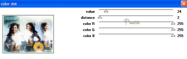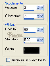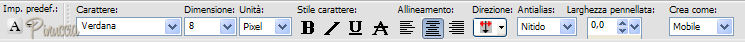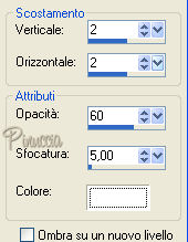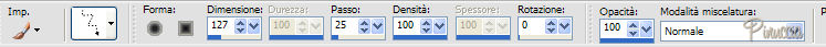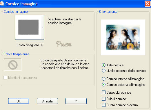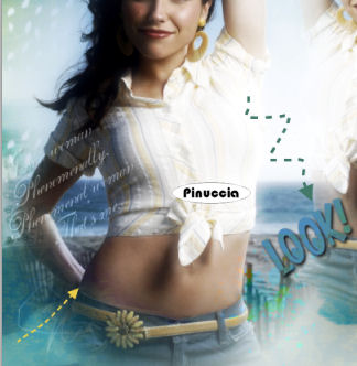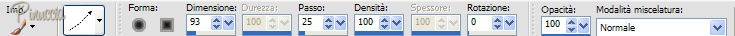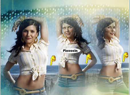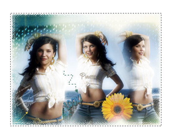 qui puoi trovare qualche risposta ai tuoi dubbi. Se l'argomento che ti interessa non è presente, ti prego di segnalarmelo. Questo tutorial è stato realizzato con PSP X. Occorrente: il tube di una donna, un pennello, 2 font, una maschera, una cornice e diversi elementi scrap qui Il tube è di "Brigitte", gli elementi scrap sono di "Melissa". Filtro Eye Candy 4000 qui in caso di problemi, qui trovi alcuni appunti. Se non hai trovato la risposta che cercavi, per favore, fammelo sapere. Questo tutorial è stato scritto in PSP XI, ma può essere eseguito con qualsiasi versione del programma. Per tradurlo, l'ho eseguito con PSP X. Occorrente: Materiale qui Nel corso del tutorial ti servirà la cornice-immagine "Bordo disegnato 02", che dovrebbe essere standard nel tuo PSP. Se non dovessi trovarla, metti la cornice-immagine "Corel 09-039" (fornita con il materiale) nella cartella Cornici-immagini di PSP. Metti i pennelli nella cartella dei Pennelli. tutti i pennelli forniti sono composti da due files, che non devono essere separati. Vedi alcuni appunti sui pennelli qui Filtri: Xero qui Filters Unlimited 2.0 qui Penta.com qui 1. Apri le tre immagini, duplicale con shift+D e chiudi gli originali. 2. Attiva la trame "3t01_set". Questa sarà la base del tuo lavoro. 3. Attiva l'immagine 02. Livelli>Carica/salva maschera>Carica maschera da disco. Cerca e carica la maschera 20-20: ![]() 4. Livelli>Elimina, e rispondi sì alla domanda Unire la maschera nel livello corrente?. ![]() Livelli>Unisci>Unisci gruppo. 5. Modifica>Copia. Torna al tuo lavoro (la trama 3t01_set) e vai a Modifica>Incolla come nuovo livello. 6. Immagine>Ridimensiona, al 70%, tutti i livelli non selezionato. 7. Posiziona l'immagine a destra, vedi l'esempio finale.8. Attiva l'immagine 01. Ripeti i passaggi dal 3 al 6. Immagine>Rifletti. Posiziona l'immagine a sinistra della precedente, vedi l'esempio finale.9. Attiva l'immagine 04. Livelli>Carica/salva maschera>Carica maschera da disco. Cerca e carica la maschera 20-20: ![]() Livelli>Elimina, e rispondi sì alla domanda Unire la maschera nel livello corrente?. ![]() Livelli>Duplica, 3 volte. Livelli>Unisci>Unisci gruppo. Modifica>Copia. Torna al tuo lavoro (la trama 3t01_set) e vai a Modifica>Incolla come nuovo livello. Immagine>Ridimensiona, al 70%, tutti i livelli non selezionato. Posiziona l'immagine a sinistra.Il mare deve trovarsi allo stesso livello per tutta la larghezza dell'immagine. Dovresti avere questo: ![]() Livelli>Unisci>Unisci visibile. 10. Regola>Morbidezza>Fuoco diffuso: ![]() 11. Effetti>Plugins>Xero - Radiance: ![]() 12. Attiva il tube del fiore "DaisyWeb_AfricanSunGerbera", e vai a Modifica>Copia. Torna al tuo lavoro e vai a Modifica>Incolla come nuovo livello. 13. Immagine>Ridimensiona, al 40%, tutti i livelli non selezionato. Nella paletta dei livelli cambia la modalità di miscelatura di questo livello in Schiarisci. Sposta il fiore tra le due ragazze a destra, vedi l'esempio finale.14. Attiva il tube "Mot 1" e vai a Modifica>Copia. Torna al tuo lavoro e vai a Modifica>Incolla come nuovo livello. Immagine>Ruota per gradi, 30 gradi a sinistra. ![]() 15. Nella paletta dei livelli cambia la modalità di miscelatura di questo livello in Scurisci. Sposta il testo come nel mio esempio.16. Effetti>Effetti 3D>Sfalsa ombra: ![]() Livelli>Nuovo livello raster. 17. Imposta il colore di primo piano con #e8cc4a. Attiva lo strumento Pennello ![]() Cerca e seleziona il pennello "phoenix_psp_arrow003", dimensione 93: ![]() Applica il pennello a sinistra del blend, vedi l'esempio finale. Livelli>Nuovo livello raster. 18. Imposta il colore di primo piano con #4f8c9c. Attiva lo strumento Pennello ![]() cerca e seleziona il pennello "phoenix_psp_splatters006", dimensione 150, ![]() e applicalo come nell'esempio sotto: ![]() Nella paletta dei livelli cambia la modalità di miscelatura di questo livello in Saturazione. Livelli>Nuovo livello raster. 19. Imposta come colore di primo piano #437968. Attiva lo strumento Pennello ![]() cerca e seleziona il pennello "phoenix_psp_arrows006", dimensione 127, ![]() e applicalo come nell'esempio sotto: ![]() Livelli>Nuovo livello raster. 20. Imposta il colore di primo piano con il bianco #ffffff, Attiva lo strumento Pennello ![]() cerca e seleziona il pennello "@cb_prose3", dimensione 165, ![]() e applicalo a sinistra, vedi l'esempio finale. Effetti>Effetti 3D>Sfalsa ombra, con i settaggi usati al passo 16. ![]() Nella paletta dei livelli cambia la modalità di miscelatura di questo livello in Luminanza. Immagine>Ruota per gradi, 30 gradi a sinistra. ![]() Livelli>Unisci>Unisci visibile. ![]() 21. Immagine>Cornice-immagine, cerca e seleziona la cornice "Bordo disegnato 02". ![]() 22. Attiva lo strumento Selezione , rettangolo,e seleziona il contorno del blend, come nella schermata sotto: ![]() Livelli>Unisci>Unisci visibile. 23. Modifica>Copia. Modifica>Incolla come nuova IMMAGINE. Continuerai a lavorare su questa immagine. 24. Immagine>Ridimensiona, a 700 pixels di larghezza, tutti i livelli selezionato. Livelli>Nuovo livello raster. 25. Mantieni come colore di primo piano il bianco #ffffff. Attiva lo strumento Selezione , rettangolo,e disegna un piccolo rettangolo come nell'esempio sotto: ![]() 26. Riempi il rettangolo con il colore bianco,poi abbassa l'opacità di questo livello al 67%. 27. Effetti>Plugins>Filters Unlimited 2.0 - Edges Square - Square edge 01. Selezione>Deseleziona. 28. Imposta il colore di sfondo con #274f57, e chiudi il colore di primo piano. Attiva lo strumento Testo , font Verdana, dimensione 8, pennellata 0,e scrivi l'indirizzo del tuo sito. ![]() Livelli>Nuovo livello raster. 29. Imposta il colore di primo piano con #274f57. Attiva lo strumento Pennello ![]() Cerca e seleziona il pennello "phoenix_psp_tinytext003", dimensione 150, e applicalo sotto l'url come nell'esempio sotto: ![]() Livelli>Nuovo livello raster, e rinomina il livello "Testo 1". 30. Imposta il colore di primo piano con #6c9096, e il colore di sfon